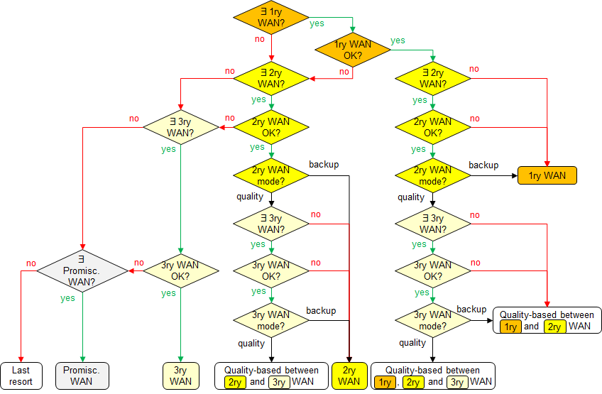 Backup: the Tertiary WAN can be selected instead of the Secondary WAN if this one is broken, and only in that case. The decision diagram below summarizes the whole mechanism (where 1ry stands for Primary, 2ry stands for Secondary, 3ry stands for Tertiary, Promisc. stands for Promiscuous [a WAN Access that has no WAN specified is considered to be attached to an internal WAN called “Promiscuous”] and Ǝ ...? stands for "Does ... exist?" - or "Is there a ... available?"). |