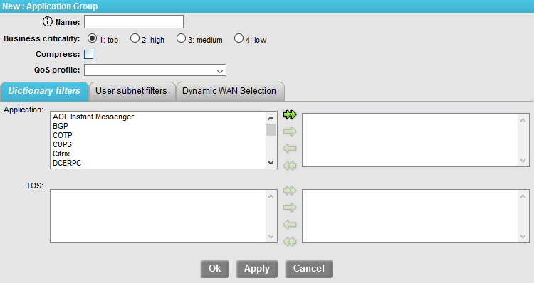 Tertiary WAN: specify the last acceptable WAN for this Application Group by selecting it in the left frame and pushing it to the right with the single right arrow. If several WANs are selected, then load balancing will be applied between them. |