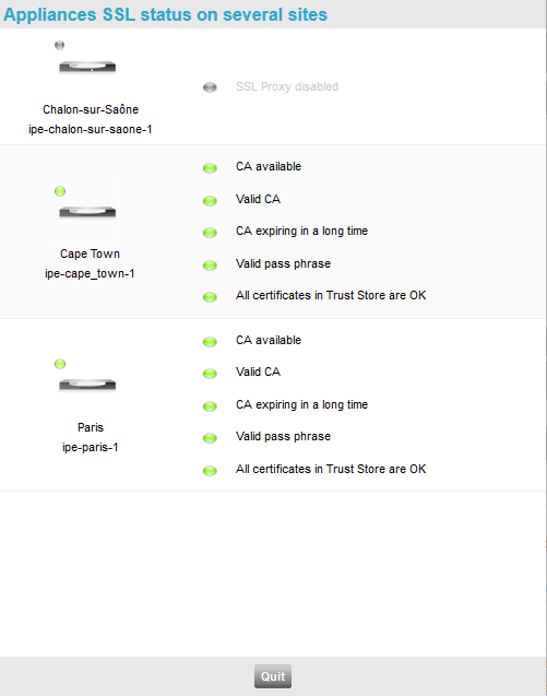 By right-clicking one or several Sites, you can use the Show Status function to display an SSL status summary of their appliances: |