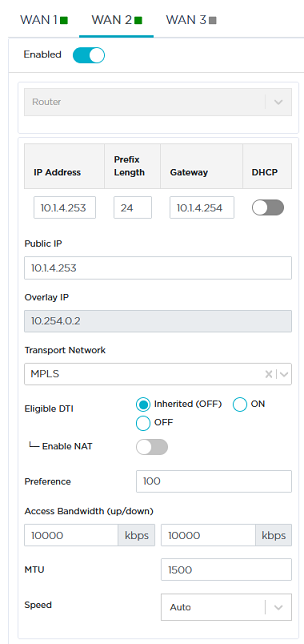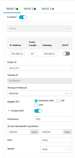 This interface is automatically eligible to DTI (Inherited ON) because you globally activated this policy for the 'Internet' Transport Network (refer to Advanced Configuration -> Transport Network Settings). You may also manage DTI individually for this Internet L3 interface by checking the ON or OFF options. |